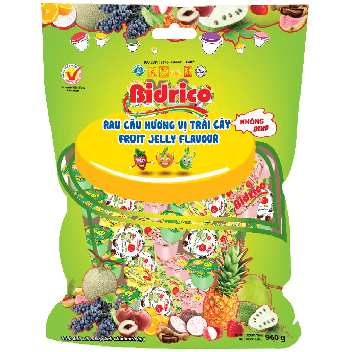 ContactBidrico fruit jelly flavor is a combination of jelly powder, flexible and crispy coconut jelly and sweet and sour taste from fruits: corn, banana, guava, pineapple, mango, soursop, coconut, orange, melon, etc. This blend brings an interesting and delicious experience, suitable for taste of every family member.