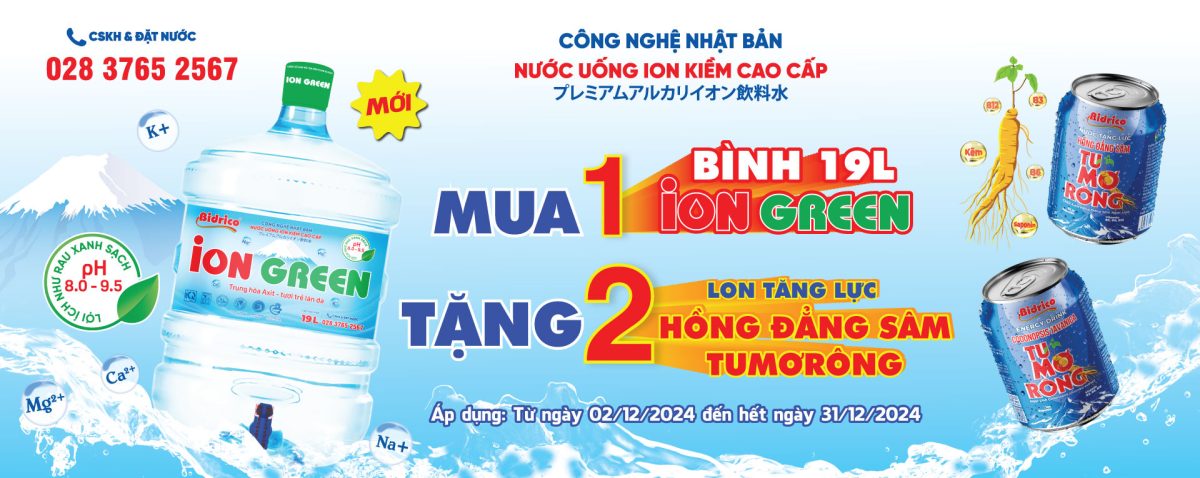Từ ngày 2/12 – 31/12/2024, khi khách hàng MUA 1 BÌNH nước Ion kiềm cao cấp ION GREEN 19l sẽ được TẶNG 2 LON nước tăng lực Hồng Đẳng Sâm Tu Mơ Rông giúp tăng cường sức khoẻ và duy trì năng lượng.